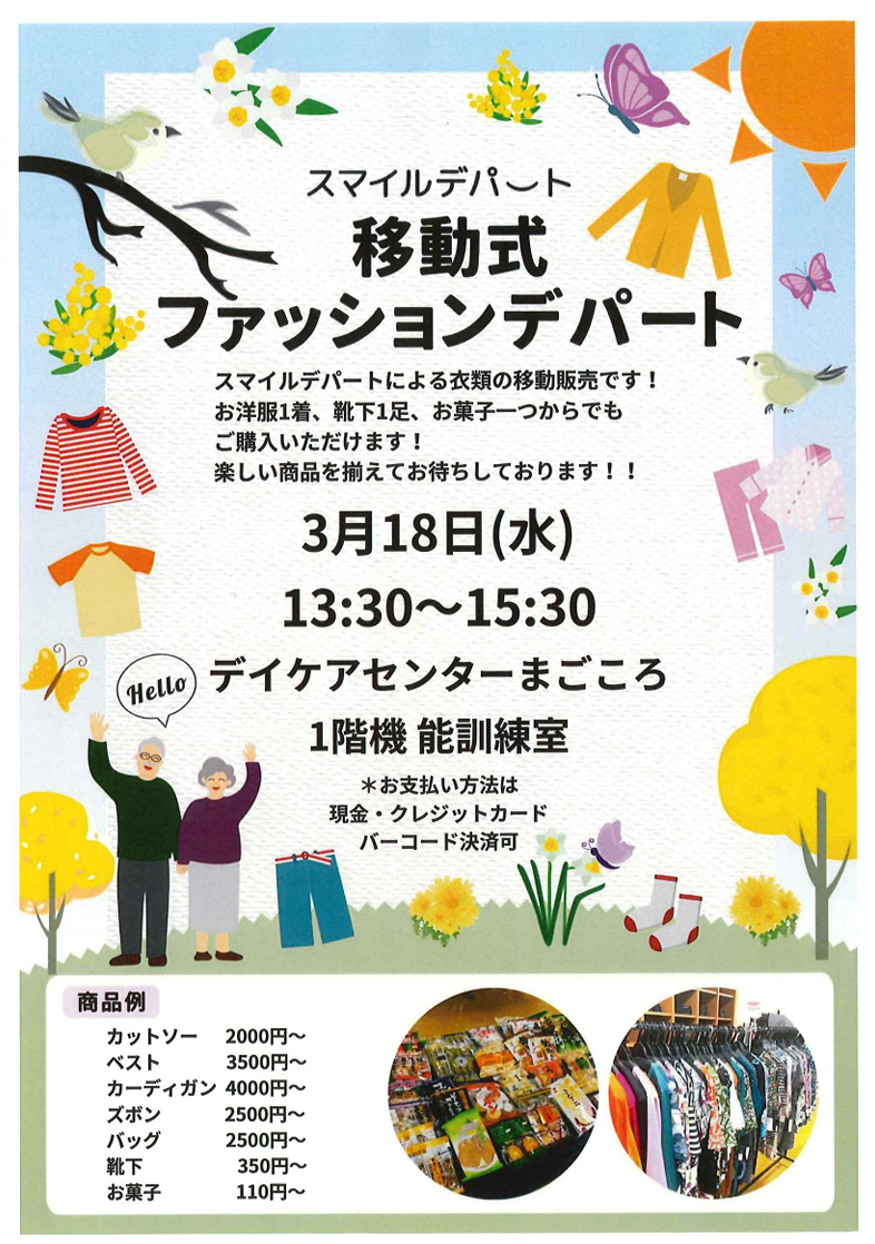 まごころでは3月18日に移動式デパートをお呼びしての買い物レクを開催します。
