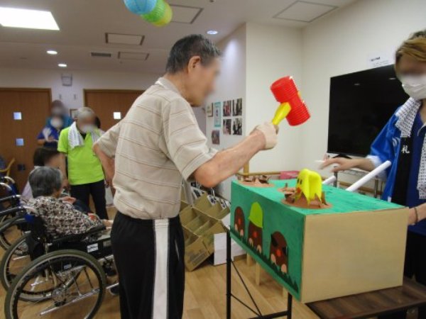 施設職員が作成した小物や道具もあり、もぐらたたきはスタッフと入居者様の読み合いが起きていました!